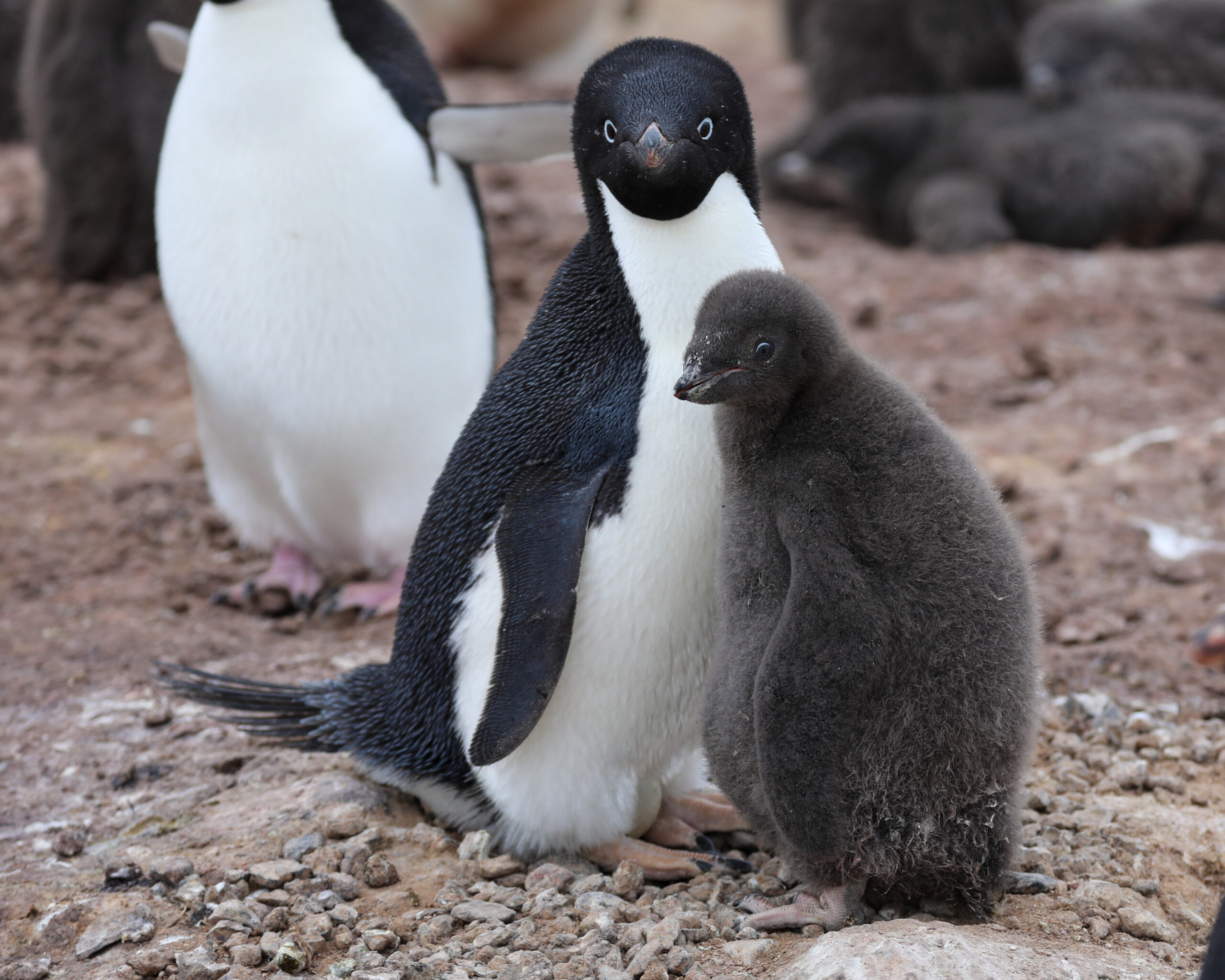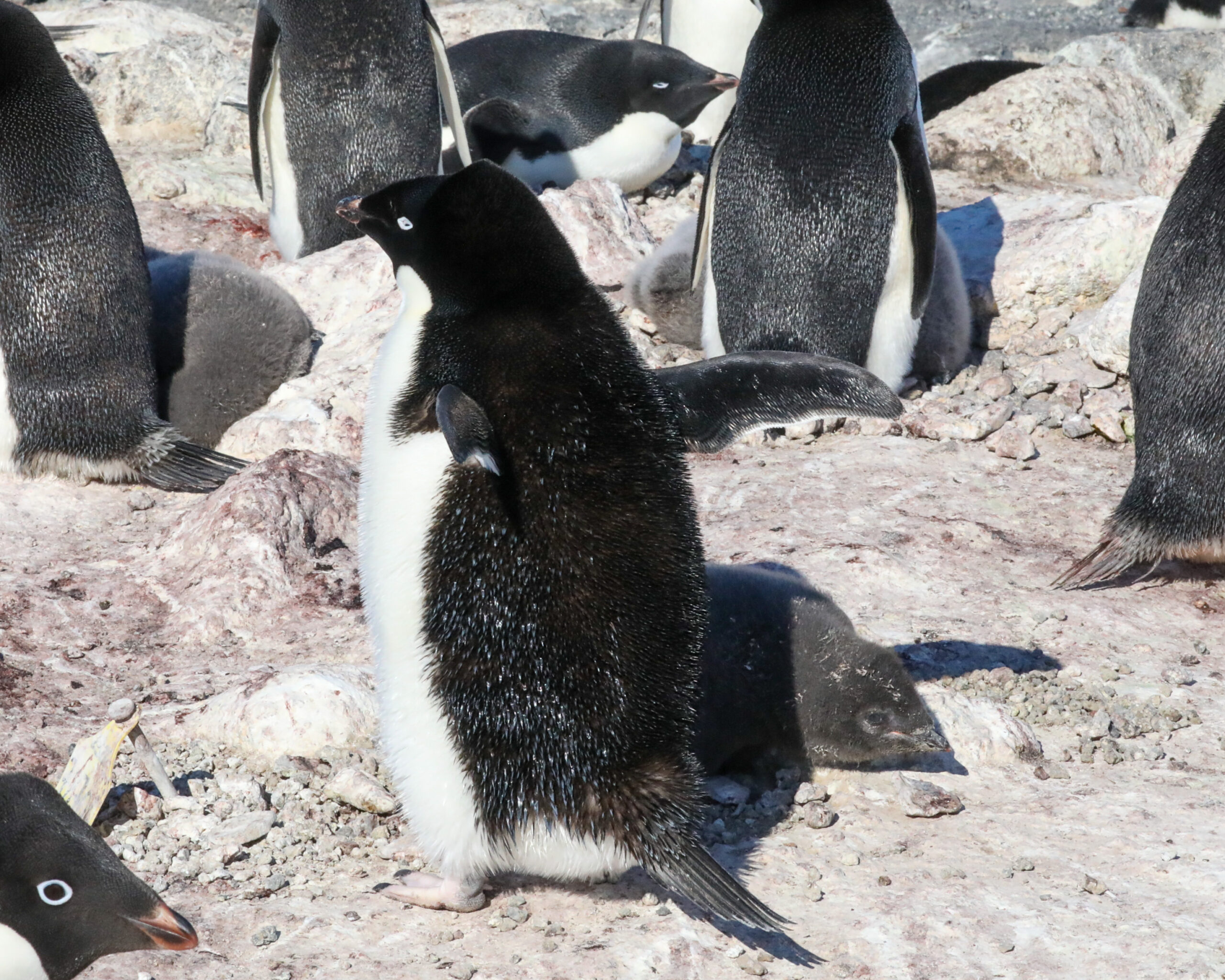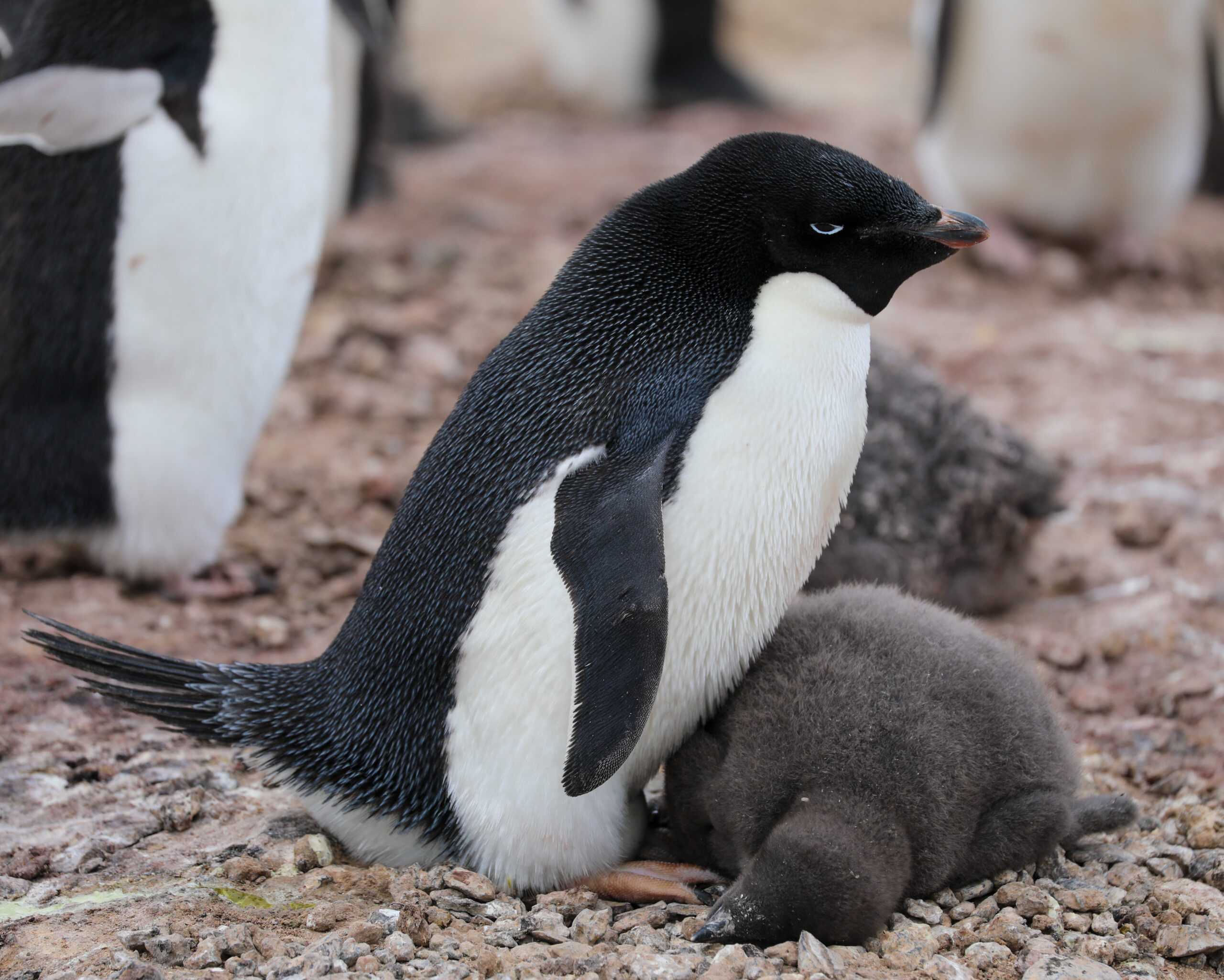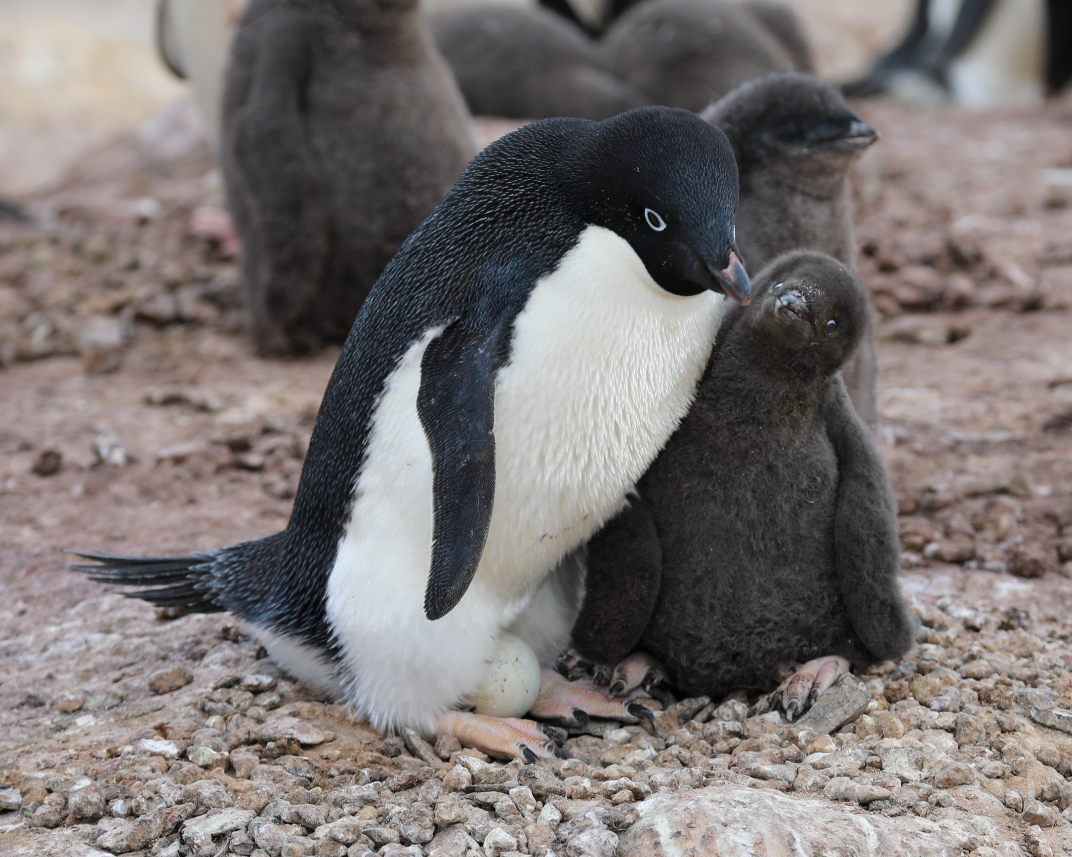 The female is on the nest now, though her mate is nearby. She is caring for their chick while still keeping their egg warm. Penguins take turns on the nest so their chicks stay safe and fed.